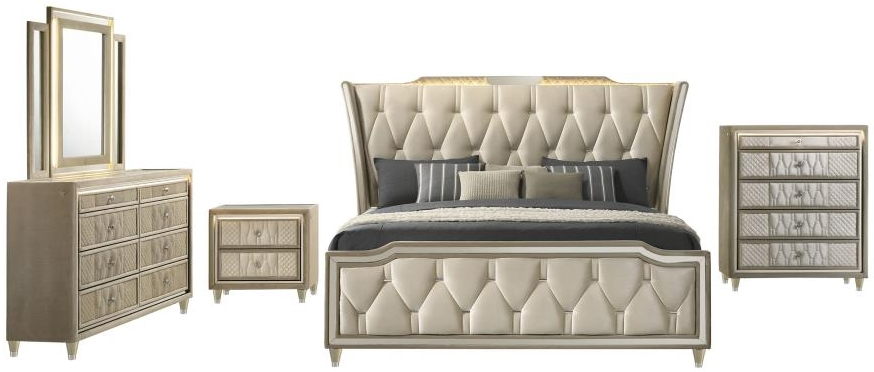 Includes: One (1) eastern king bed, one (1) nightstand, one (1) dresser, one (1) dresser mirror, and one (1) chest of drawers