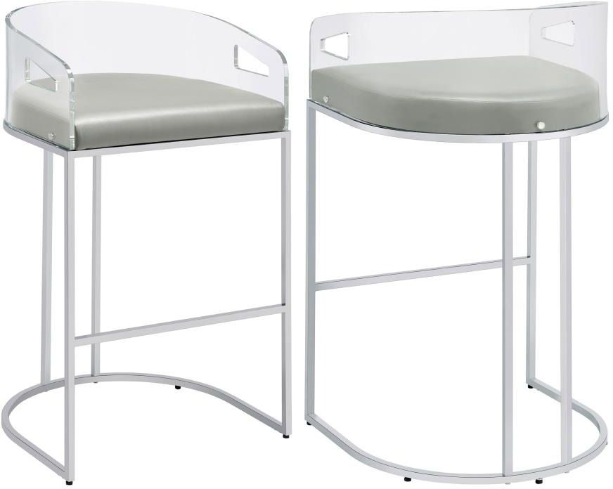 Ultra-modern with a retro-inspired vibe, this pair of stools make a striking piece to a dining room space. With a curved backrest in a clear acrylic material, each stool offers an open and airy design. Rest comfortably on a leatherette cushion as you dine or sip a cocktail. In addition, each stool is supported by a slim metal legs in a lustrous chrome finish and a base shape that mimics the rounded acrylic backrest. Pull up a pair of these stools to a kitchen bar or complete a compact home bar.