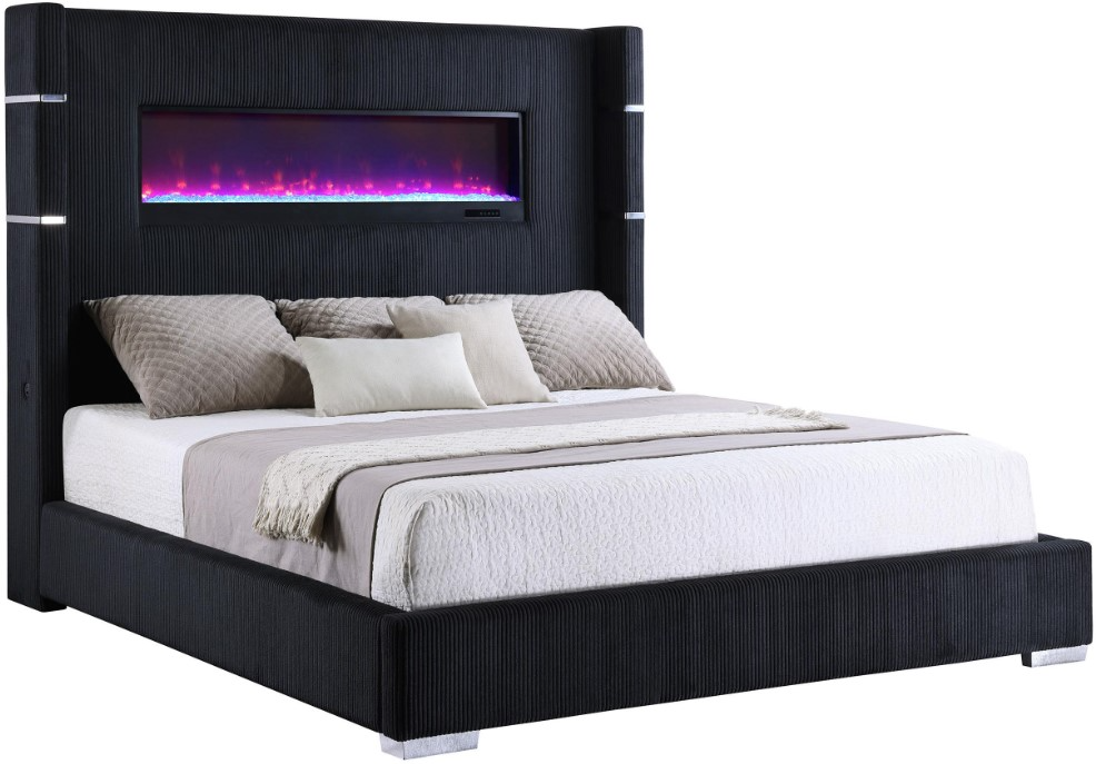 Queen size upholstered wingback panel bed with integrated flame box