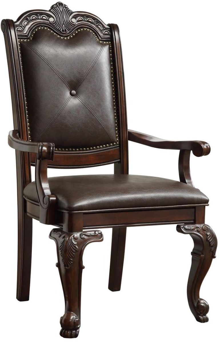 Add great elegance with this upholstered armchair set to your traditionally styled dining room. A wealthy brown wood complete paired with dark brown faux leather creates a formal high-end look. Carved details are featured throughout the chair and thick stitching on the seat back provides added elaborate detail.Read More