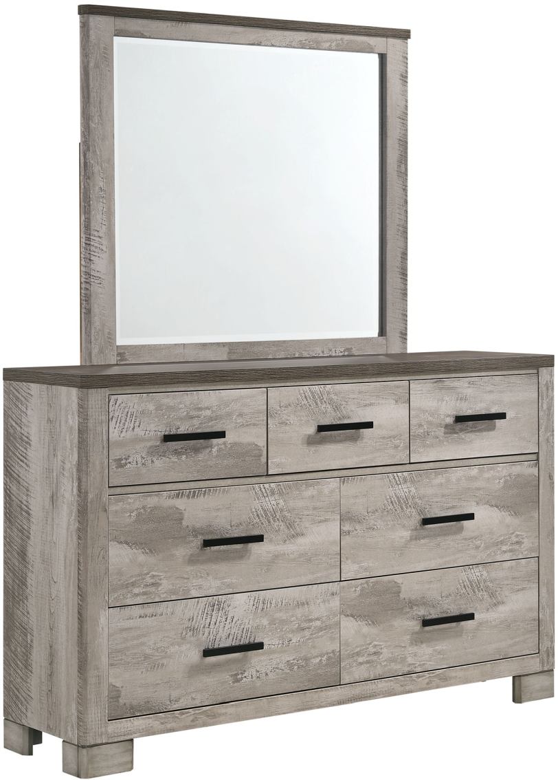Elevate your bedroom with the Millers Cove dresser and mirror. Featuring a weathered gray finish, clean lines, and spacious drawers, this piece offers the perfect mix of style and function. The coordinating mirror adds depth and brightness, making this set a stunning and practical centerpiece for your room.Read More