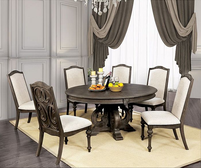 Beautiful wood inlay details and a dramatic pedestal base create a grand statement with elegance galore. The ivory fabric upholstered chairs provide a stunning contrast against the rustic natural tone finish for a look that is as cozy as it is chic.Read More
