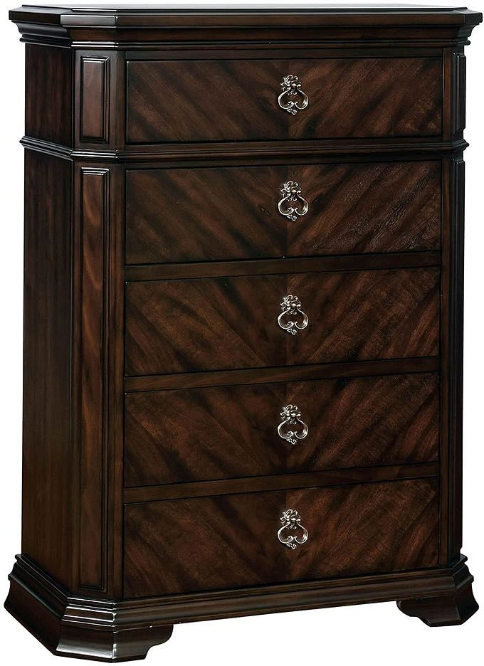 This stately bedroom chest features a classic rich espresso finish, clipped corner and strong trim lines grounded them in sophisticate appeal. The deep wooden grain patterns on the drawer face combine with the antique pulls to exude elegance.