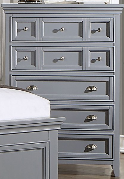 Take serenity home with this chest from the Castile collection. Topped with beautiful crown molding details, the gray finish and the nickel cup pulls complement each other well in tone and hue.Read More