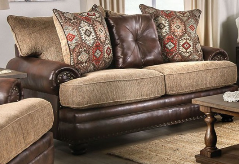 Fearlessly mix traditional designs with rustic palettes and textures. The contrast of soft chenille with masculine leatherette is makes for a tantalizing experience. Highlighting the contrasting styles further is a the curling rolled arms and nailhead trimming. The usually shimmering silver dots are replaced by brass heads for homemade finish that frames the unique set pieces.Read More
