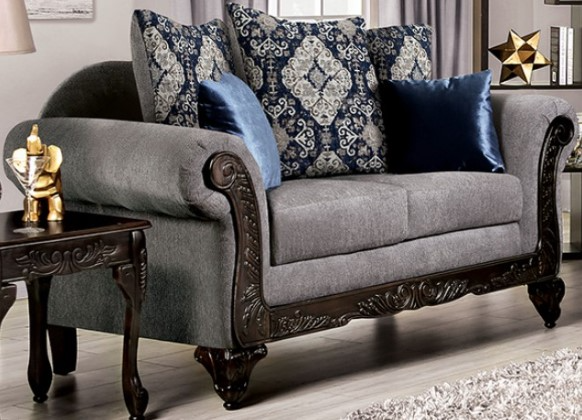 A regal affair of contrast, lustrous soft chenille and walnut-finished wood come together to form a dynamic design that is truly magnificent in style. The gray fabric is the base upon which all the other elements rest upon: from the deep blue throw pillows to the oversized patterned pillow backs in navy.Read More