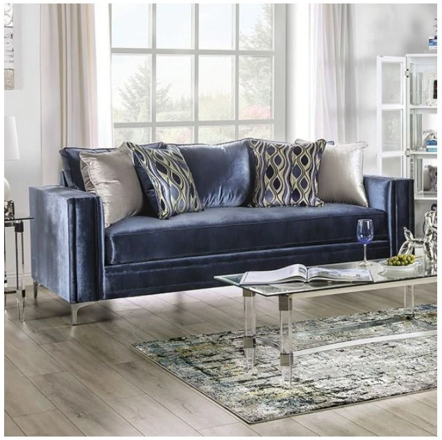 The dynamic vibe of blue satin emanates from this awesome-looking Jodie sofa that is completely American-made! Includes matching pillows of surreal design and is shown in the satin blue and silver color finish.Read More