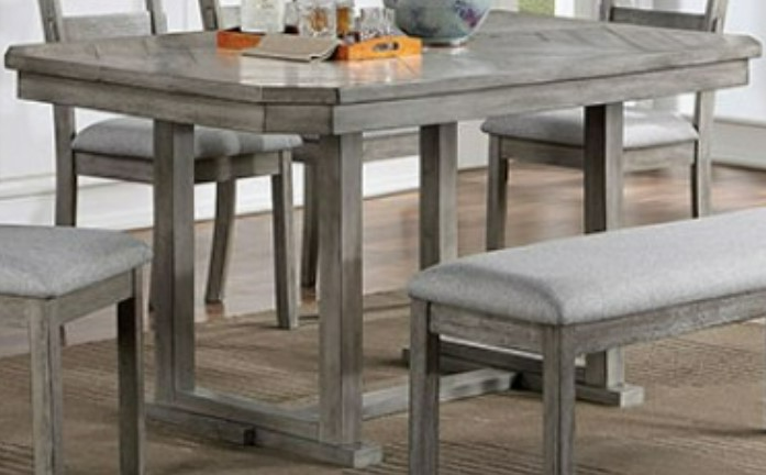 This distinctly shaped table will help you build an outstanding dining space. The gray table top features a hint of warm tone, displaying a diamond wood grain pattern that plays off the cut-out corners. Playing off the same hue is the soft gray linen-like fabric, offering comfortable seating on the matching chairs and bench.Read More