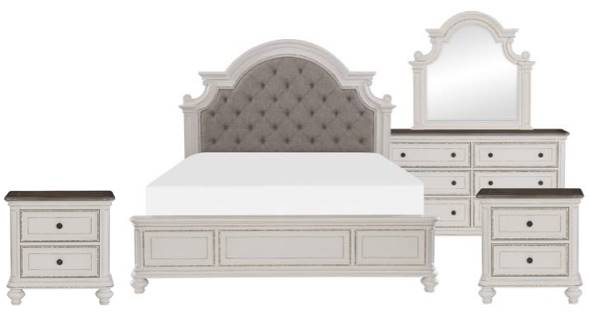 Set includes: Queen bed, Two (2) Nightstand, Dresser, and Mirror