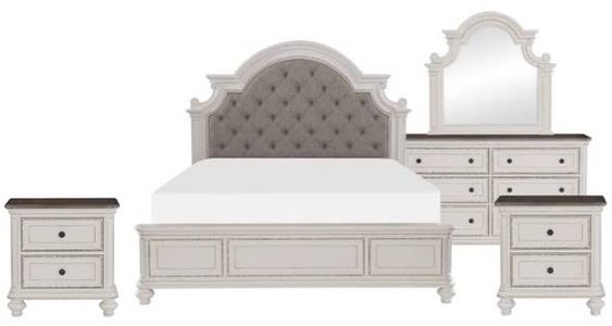 Soft, sweeping curves define the elegant profile of the Baylesford Collection. The bedroom is softened by an antique white rub-through finish with brown-gray finished framed-plank case good tops, creating a romantic aesthetic will place beautifully within your bedroom.Read More