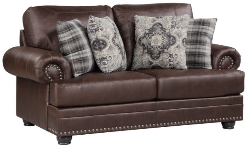 With a refined look that is steeped in traditional design, the Franklin collection provides a timeless elegance to your living room. Dark brown polished microfiber covers the frame of the love seat while traditional rolled arms, and nailhead trim provide classic detail to profile of the love seat.Read More