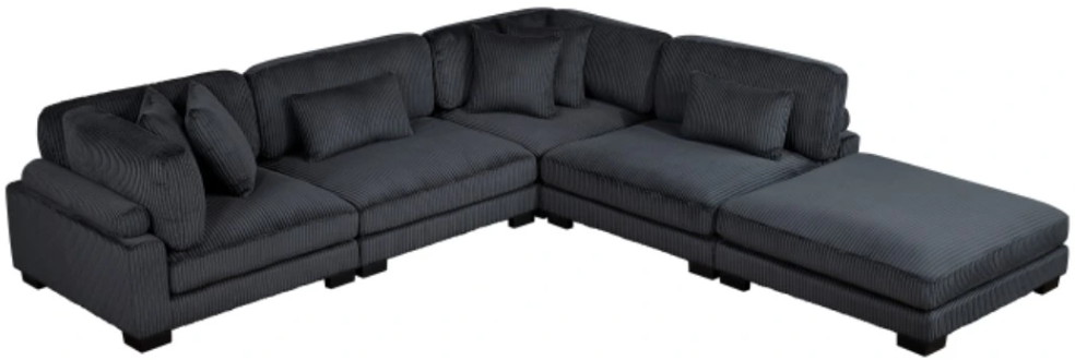 Configurable to your available space, the Traverse Collection allows for the addition and detachment of pieces for customized seating experience. The 5-piece sectional configuration consists of two corner units paired with two armless chairs, and an ottoman. The plush black corduroy fabric upholstery creates a plush expanse for a soft touch experience.Read More