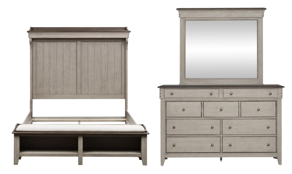 Create a relaxing retreat with the Ivy Hollow queen mantle storage bed, dresser, and mirror. Crafted of poplar solids with pine and alder veneers, this kit features a heavily distressed weathered linen finish with saw marks and dusty taupe tops.Read More