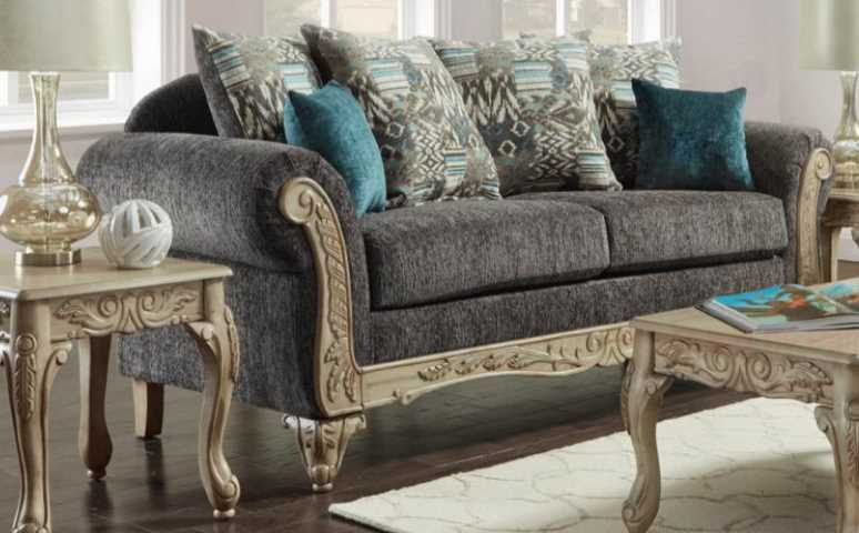 Add a touch of elegance and comfort to your living room with this Camila Sofa from Neoliving. Shown in gray fabric, this sofa features a light brown carved wood frame and rolled arms. Add this piece to your living room to create a stylish space that everyone will admire.Read More