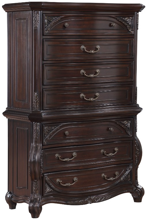Traditional Elegance: Showcasing ornate carvings and elegant drawer pulls, this design embodies timeless sophistication and exceptional craftsmanship. The signature circular carving, a hallmark of the collection, is prominently displayed on the fronts of the chest, adding a touch of distinction and harmony