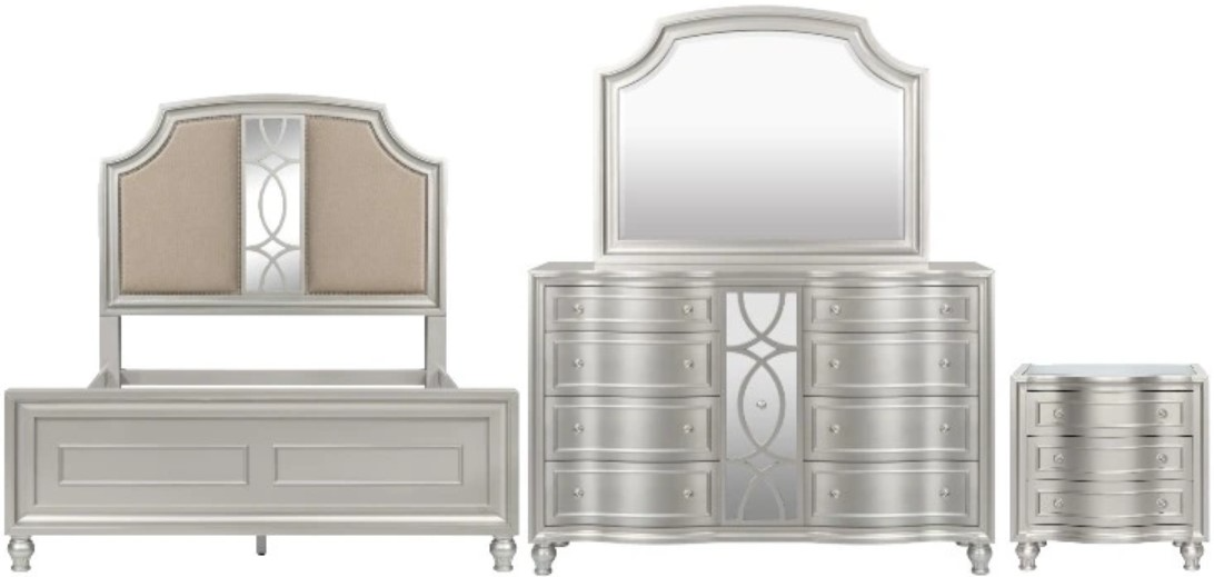 The Reflections bedroom set offers a sleek, modern look with a matte silver finish. The set includes a queen bed, nightstand, dresser, and mirror, all featuring clean lines, elegant details, and ample storage, perfect for a stylish, contemporary bedroom.Read More
