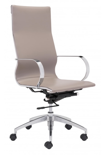 Glider high back office chair features a slim yet comfortable profile, high back with added lumbar support, soft 100% Polyurethane upholstery and chrome arms. You will sit in elegant fashion as smooth glides create effortless motion. Tilting mechanism and seat height are both adjustable as hydraulic piston sit on metal star base to seamlessly glide you into place.Read More